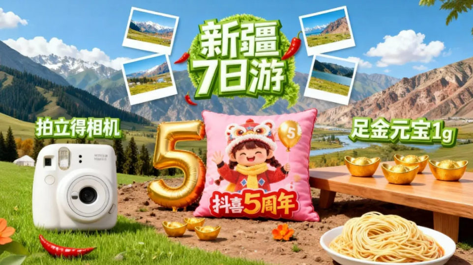 赢7日新疆游、金元宝、拍立得、限定抱枕