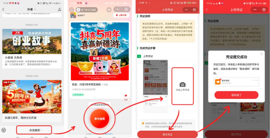 2.公众号点击下方抽奖助手,上传抖喜外卖订单或团购核销订单截图,点击参与抽奖。